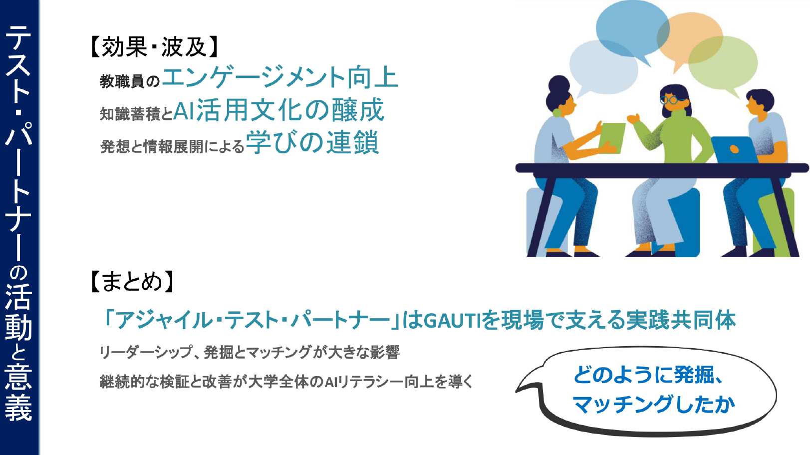 一つの成功体験が職員の自信となり、生成AIによる奨学金Q&Aチャットボット、在籍確認アプリ、落とし物確認システム、オンライン検収予約システムとその運用体制の構築、IR分析資料の内製と経営分析への活用や、他部署への業務改善波及など、ポジティブな変革の連鎖について報告されました。