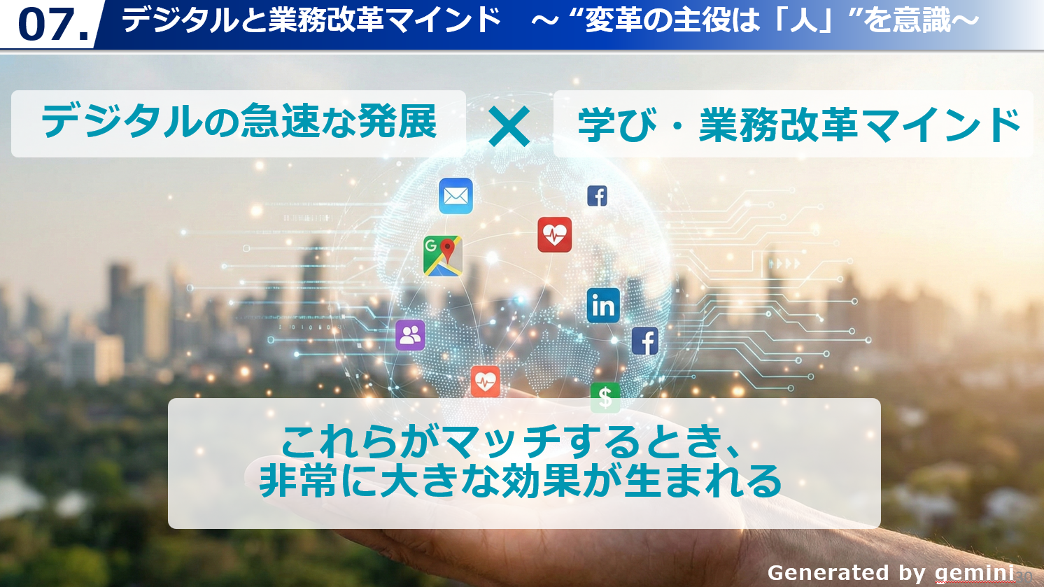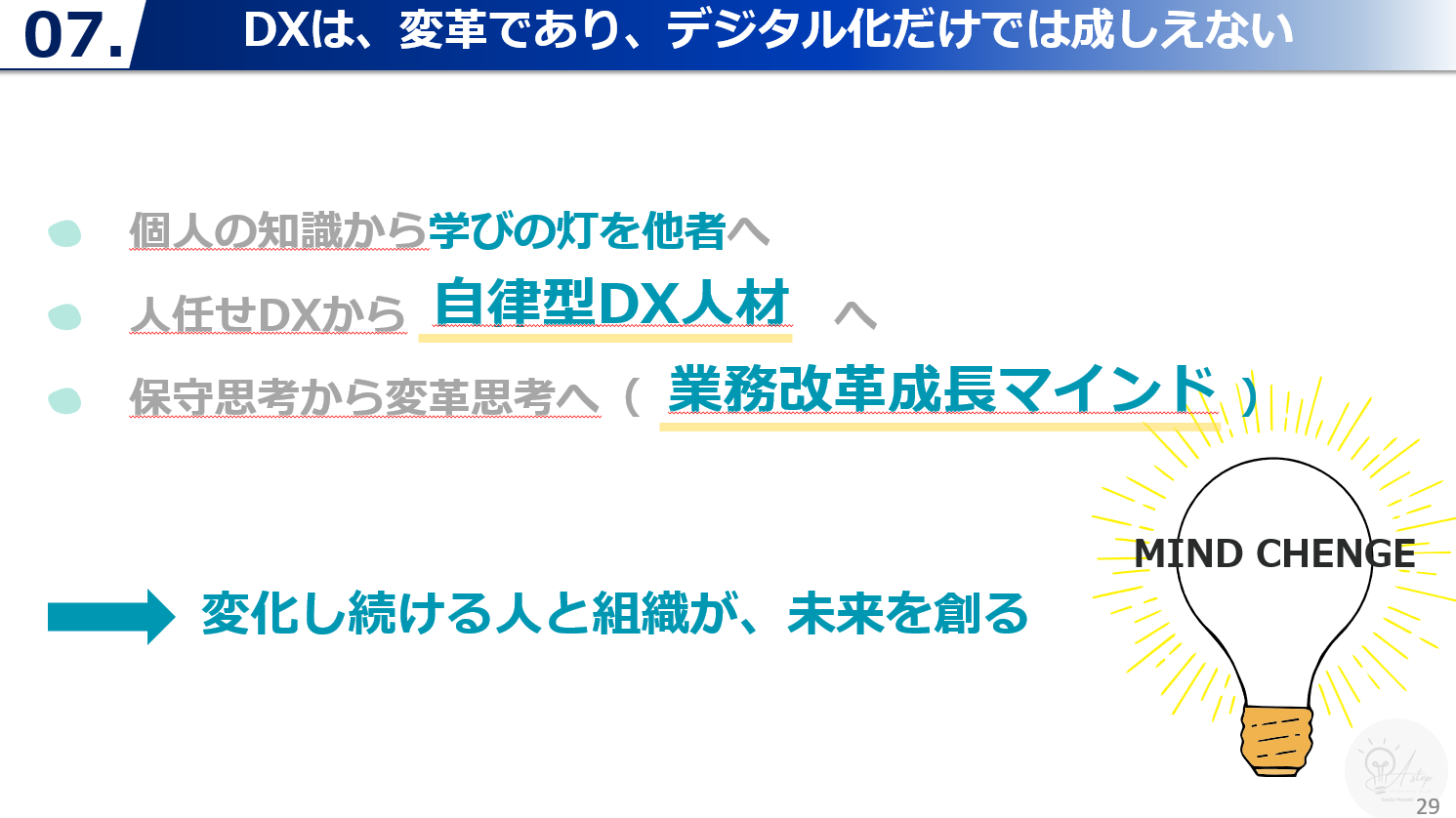 「学びの灯を他者へ」を合言葉に「業務改革マインドセット研修」を実施しています。研修内製化の取組と、研修を受講した職員がその後に講師として登壇し、学びを他者へ還元する「学びの好循環」が生まれている点など、個人のスキルアップを組織の成長へと繋げる取組が報告されました。上述の「理論と生成AIを融合させた学習機会の提供」を参照ください。 - 3 変革の連鎖: