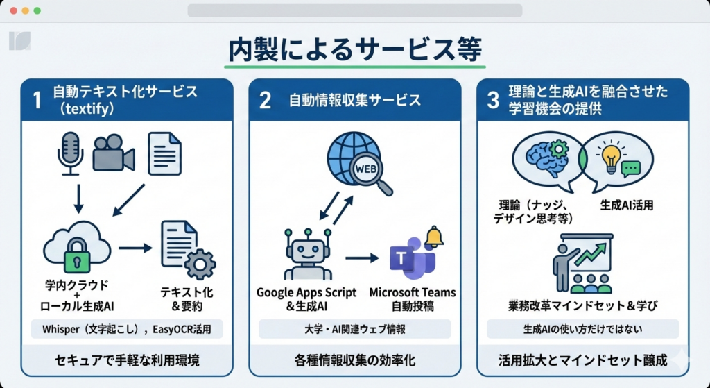 Whisper(文字起こし)やEasyOCRを活用し、学内クラウドとローカルの生成AIを連携させることで、セキュアで手軽な利用環境を実現しています。 - 2 自動情報収集サービス: