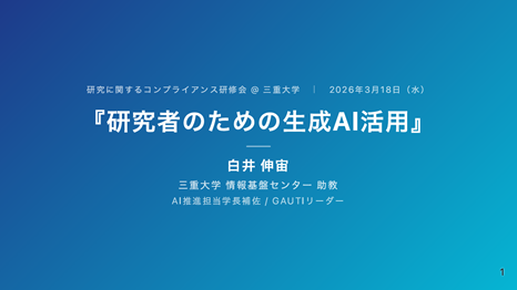 2026年3月18日(水)、三重大学にて「研究に関するコンプライアンス研修会」が開催され、当該研修会の中で『研究者のための生成AI活用』と題した講演を行いました。