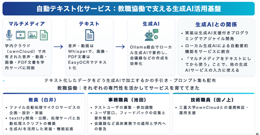 三重大学における生成AI活用検証イニシアチブ(GAUTI〔ゴーチ〕)の活動が紹介されました。教職協働で進める「自動テキスト化・要約サービス」の構築や、学内教職員向けの情報交換コミュニティの運用など、現場に即した支援体制について報告がありました。