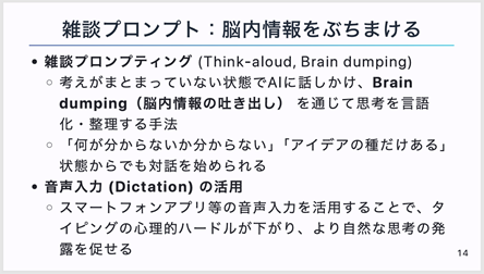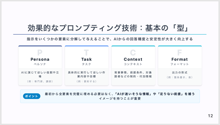 精度の高い回答を得るためのプロンプトの「型(PTCFモデル:ペルソナ、タスク、コンテキスト、フォーマット)」や、思考を言語化する「雑談プロンプト」、NotebookLMを活用した資料読解デモなど、今日から使える具体的な手法が共有されました。