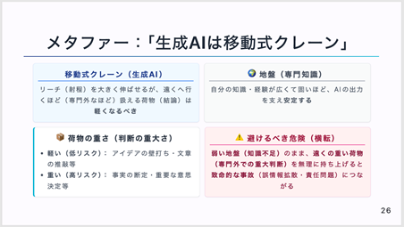 生成AIの活用を「移動式クレーン」に例え、自身の専門知識(地盤)が固いほど遠くまでアーム(生成AIによる拡張)を伸ばせるが、地盤が不安定な専門外の領域で重い判断(結論)を急ぐと、転倒(誤情報の拡散や責任問題)を招くリスクがあるという重要な考え方が示されました。