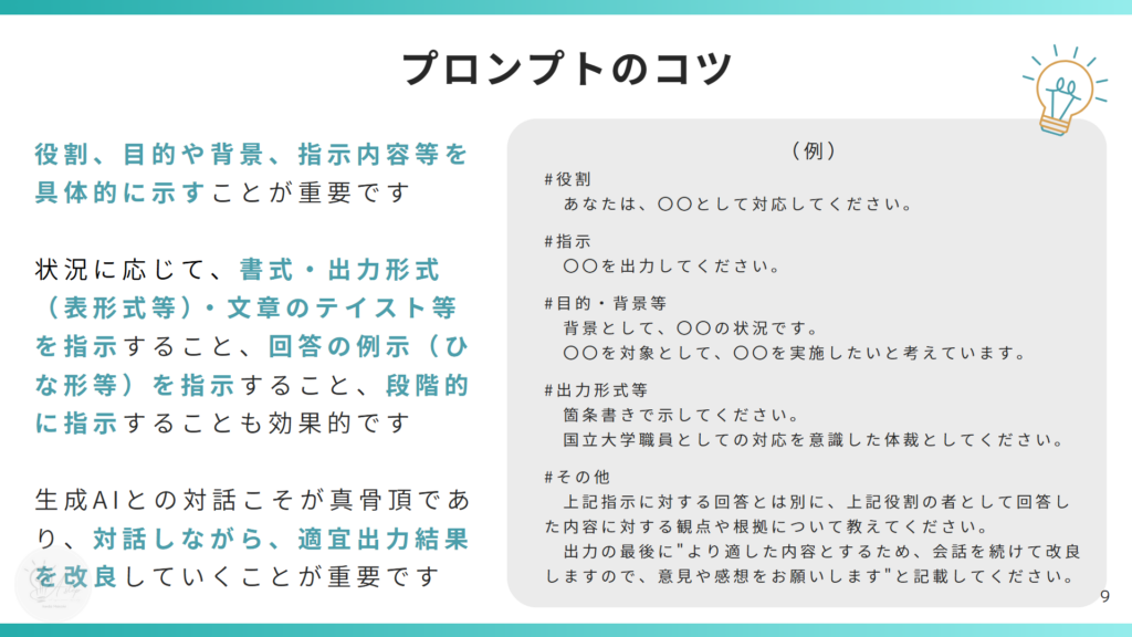 また、ウェブには様々なプロンプトのコツや事例集を公表されていますので、必要に応じてご覧ください。