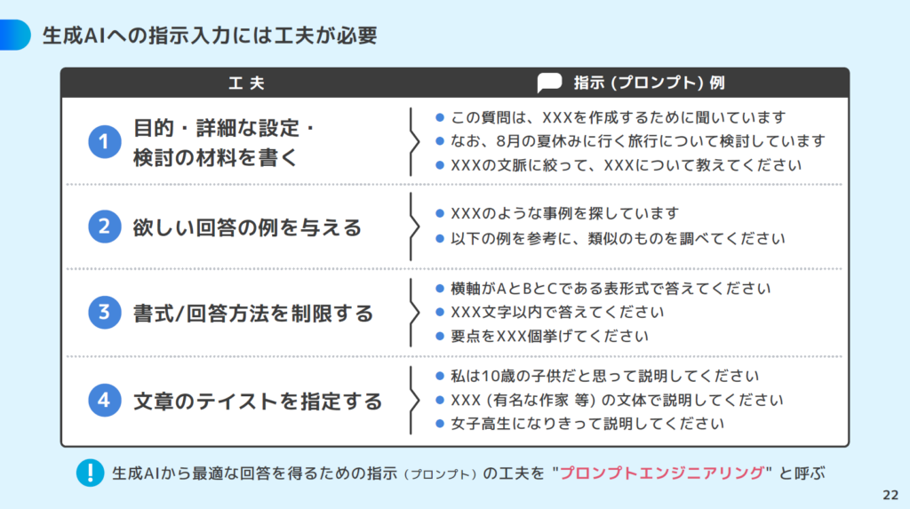 このほか、総務省においても「生成AIはじめの一歩~生成AIの入門的な使い方と注意点~」が掲載されており、プロンプトエンジニアリングについては、下記画像のように示されているので、意識したことがない方はご覧ください。