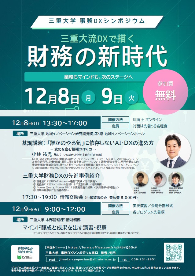 2025年12月8日(月)~9日(火)、 三重大学事務DXシンポジウムを開催します。国立大学等職員を対象として、今回は三重大学における財務DXの先進事例の紹介に加え、成果を生み出すための演習や視察を通じて、実践的な学びの場を提供いたします。