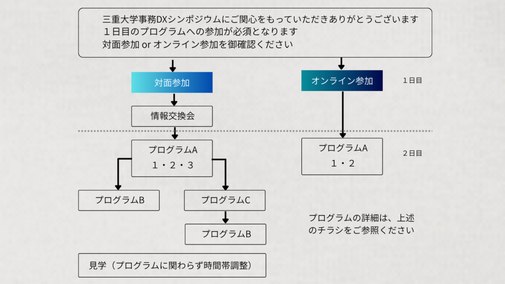 A2 1日目は全てオンラインと対面にて参加いただけます、2日目は一部のプログラムでオンライン参加可能ですが演習と視察は対面参加のみとなりますので、詳細は「プログラム」をご覧ください