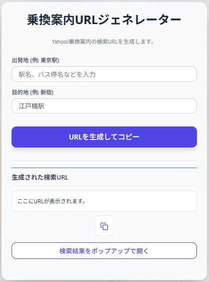 ※ Yahoo!路線案内検索する際の出発地と目的地をセットするURLを作成し、Yahoo!路線案内ページを開くツールです